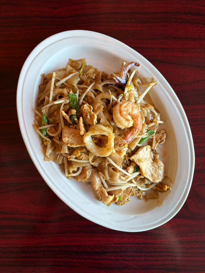 Flat rice noodle with combo of shrimp, calamari, chicken and egg, bean sprouts, scallion with savory sauce